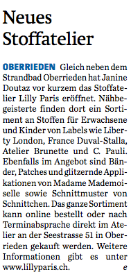 Heute stelle ich euch den dritten Shop auf meiner Liste der coolsten Stoffläden im Grossraum Zürich vor: Lilly Paris (bitte französisch aussprechen, gell!). Wenn ihr noch nicht dort wart, solltet ihr das unbedingt ändern. Das Stoffatelier ist ein Schmuckstück von einem Laden.